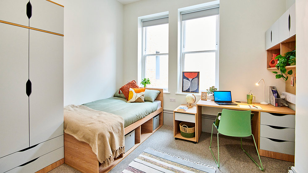 En-suite rooms are available in houses of 7-17 rooms (where 17-bedroom houses include an additional kitchenette), students here share lounge and kitchen facilities. Communal kitchens include a fridge-freezer, toaster, kettle, microwave, oven, hob and hoover. There is also a TV shared per flat with a TV licence included, however if you use your own electronic device to watch TV you'll need to purchase your own licence. Each bedroom combines a sleep/study space, including a four-foot bed (small double size), desk, small desk drawer unit, desk chair, wardrobe, and shelving. For September 2025-26 applicants, there will be 38 rooms of this type available.